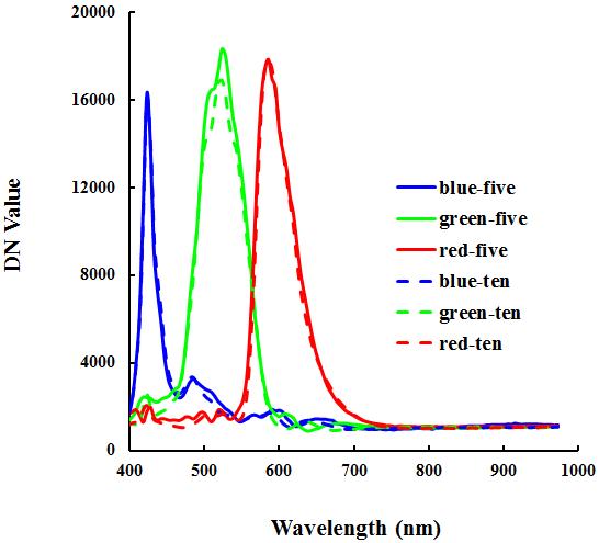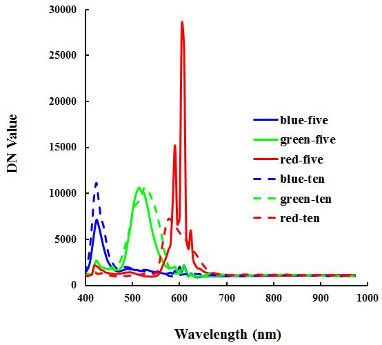 在同樣的外界條件下,利用GaiaMicro顯微高光譜成像系統(tǒng)獲取華為mate7在顯微放大5倍下脫膜前后的紅綠藍三顏色的高光譜影像數(shù)據(jù);iphone 6 plus在顯微下放大10倍下開目鏡前后紅綠藍三顏色的高光譜影像數(shù)據(jù);華為p8、iphone 5S、iphone 6 plus三款手機在顯微放大5倍、10倍條件下,紅綠藍三顏色的高光譜影像數(shù)據(jù)。利用ENVI的 ROI Tools工具統(tǒng)計同樣像元數(shù)下紅綠藍三顏色在400-100nm的光譜變化。