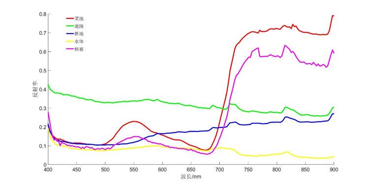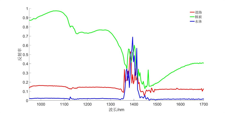 圖5為江蘇雙利合譜科技有限公司的高光譜成像系統(tǒng)在2000米高空下獲取的地物成像高光譜數(shù)據(jù),從中獲取地面的光譜信息并進(jìn)行分析數(shù)據(jù)。