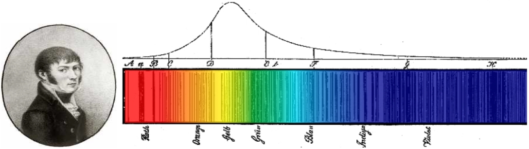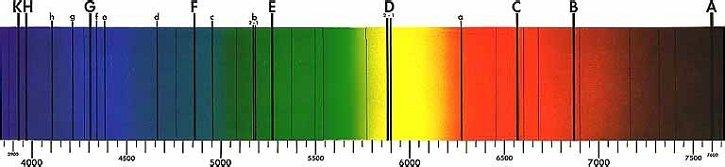 圖2.夫瑯禾費(fèi)暗線:太陽(yáng)表層元素和地球大氣的吸收,到達(dá)地表的太陽(yáng)光譜存在許多波段寬度為0.1~10 nm的暗線