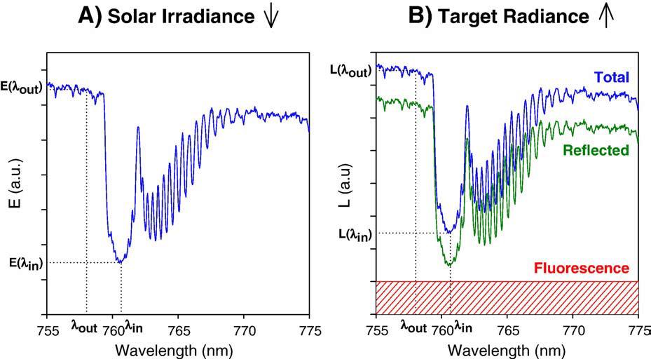 葉綠素?zé)晒夥瓷涔庾V的波段常與太陽(yáng)輻射在紅光和近紅外的3個(gè)主要的吸收波段(即656.3nm處的太陽(yáng)大氣的氫吸收線,687和760nm波段處的地球大氣層氧吸收線)相互重疊。687nm和760nm附近的氧氣吸收線形成的夫瑯禾費(fèi)暗線較明顯,熒光強(qiáng)度高。大氣中的氧分子在760nm波段附近形成了