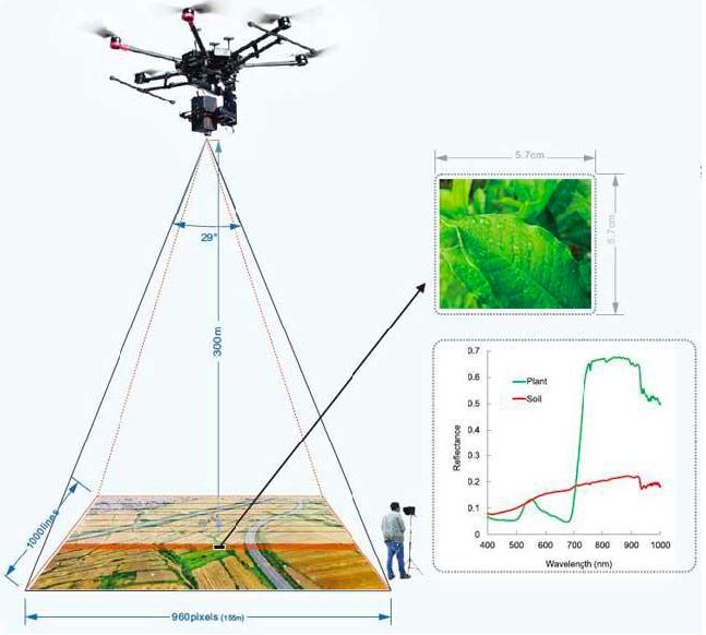 高光譜圖像不僅包含空間信息,還包含豐富的光譜信息,目前已被廣泛應用于農(nóng)業(yè)、城市規(guī)劃等領域。近年來,無人機的快速發(fā)展使高光譜在更多領域成為可能。無人機操控簡單、成本相對較低、使用靈活,航空高光譜拍攝示意圖如圖1所示。但是航空高光譜技術也存在一些限制,當追求高的分辨率時,成像儀的視場角就會變小,從而導致成像區(qū)域變小。單幅圖像很難覆蓋大面積的區(qū)域,需要運用圖像拼接技術得到一幅全景高光譜圖像。
