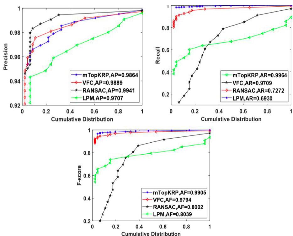 接下來,為了驗證mTopKRP算法在剔除誤匹配點上的優(yōu)越性,我們對比了mTopKRP和其他誤匹配剔除算法VFC和LPM。我們選擇精確率(precision),召回率(recall)和F-score作為評價特征點匹配算法的指標。得到的特征點匹配算法對比實驗結果如圖4所示。