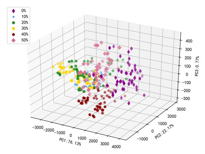 本山被用作摻假茶,約占茶葉樣品總重量的0%、10%、20%、30%、40%和50%,并與鐵觀音混合。圖2為經(jīng)過PCA后的六個等級的茶葉三維分布圖。為了對茶葉進行摻假檢測。本研究在實驗方案中建立了純鐵觀音和摻假鐵觀音的兩級判別模型,以快速鑒別摻假與否;另一方面,建立了六級判別模型,保證了在不同程度的茶葉摻假情況下,茶葉摻假程度的快速識別。