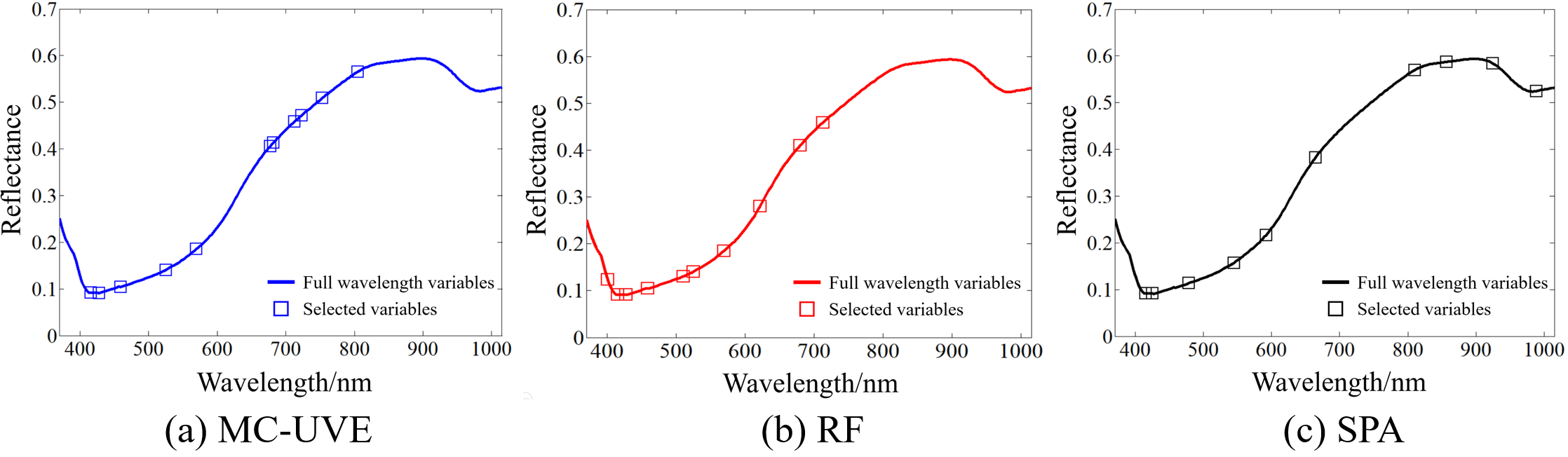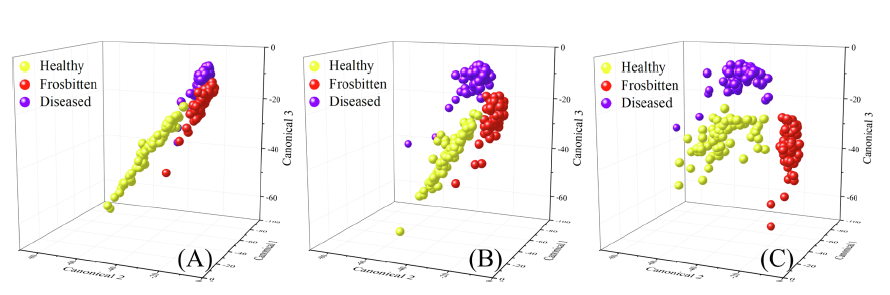 分別采用MC-UVE、RF和SPA方法提取特征波長,如圖4所示。基于這三種方法提取出的特征波長分別建立PLS-DA和LDA模型,均取得了較好的分類結(jié)果。其中RF-PLS-DA模型表現(xiàn)最好,總的判別準(zhǔn)確率高達(dá)92.86%,健康、凍死、病害三類分別的判別準(zhǔn)確率為97.14%,94.29%和87.14%。LDA分類模型的預(yù)測結(jié)果,以三維散點(diǎn)圖的形式呈現(xiàn)在圖5中。