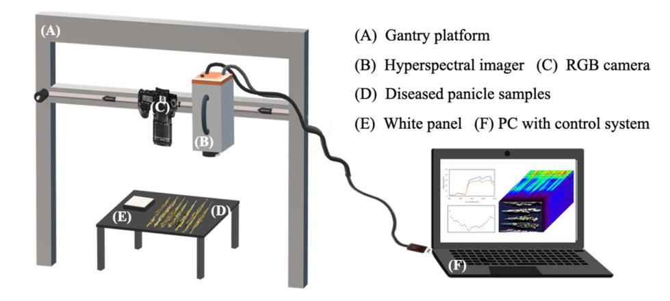 南京農(nóng)業(yè)大學(xué)程濤教授團(tuán)隊(duì)選取了江蘇常見的8個(gè)粳稻品種種植于24個(gè)2 m × 3 m大小的地塊。獲取抽穗期、開花期和灌漿期的5-8個(gè)感染穗放置于背景板上以進(jìn)行成像光譜數(shù)據(jù)采集。高光譜成像系統(tǒng)為一個(gè)搭載有數(shù)碼相機(jī)(EOS 80D, Canon)和推掃式可見光/近紅外高光譜相機(jī)(GaiaField-V10E, 江蘇雙利合譜公司)的自動線性掃描平臺(HSIA-MScope-X, 江蘇雙利合譜公司)。