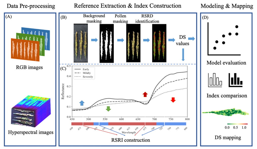水稻穗腐病(Rice spikelet rot disease, RSRD)是一種主要由Fusarium proliferatum引起的真菌病害。RSRD具有很強(qiáng)的傳染性,由于有毒病原體的存在,導(dǎo)致水稻產(chǎn)量和品質(zhì)顯著降低。因此,在侵染早期有效準(zhǔn)確地評估病害嚴(yán)重程度,對于抑制病害傳播和最大限度地減少對水稻生產(chǎn)的潛在損害至關(guān)重要。遙感技術(shù)可作為監(jiān)測作物病害的有效和非破壞性方法。