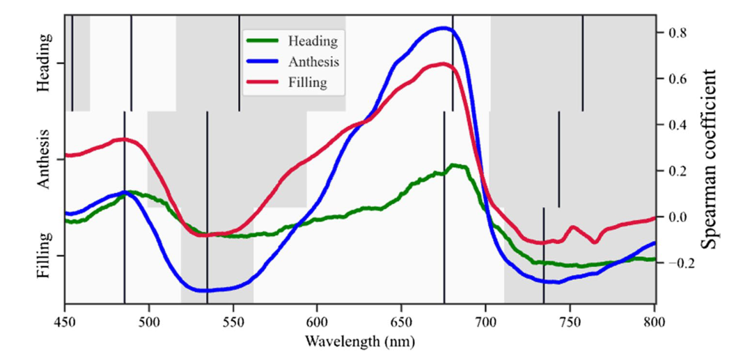 圖3 不同生長階段DS與波長反射率之間的Spearman相關(guān)系數(shù)