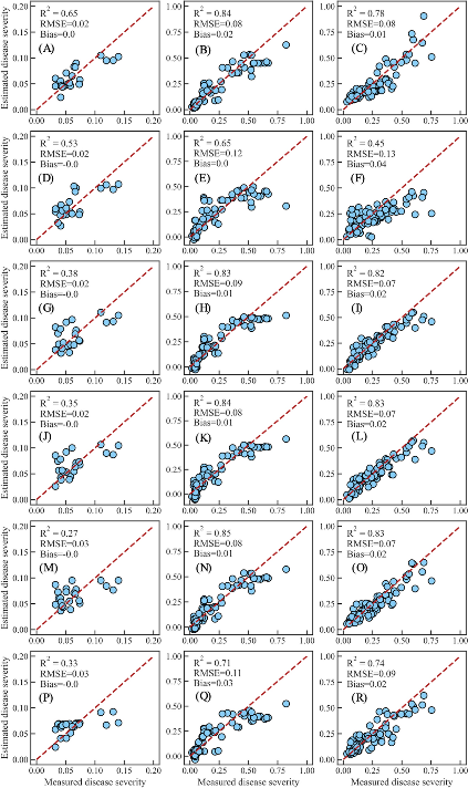 總的來說,每個(gè)SI對于DS估計(jì)精度在不同生長階段有顯著差異(圖5)。DS的量化性能以開花期最好,抽穗期最差。RSRI與現(xiàn)有SI在DS量化上表現(xiàn)出截然不同的準(zhǔn)確性。對于抽穗期,RSRI在DS量化方面的精度最好(R2 = 0.65),并且在所有五個(gè)指標(biāo)中,RSRI的RMSE和驗(yàn)證R2的置信區(qū)間(CI)最為集中。所有現(xiàn)有的SI都未能有效量化DS,他們的精度指標(biāo)在抽穗期有更大的CI。此外,現(xiàn)有SI對開花期輕度的RSRD嚴(yán)重低估,但RSRI沒有。RSRI在各個(gè)生長階段的DS量化中表現(xiàn)最好。