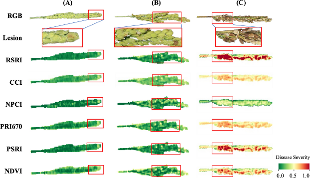 圖6 來自RSRI和現(xiàn)有SIs的三個(gè)獨(dú)立小穗樣本的RGB圖像、病變分布參考和DS圖(A、B、C分別是輕微感染、輕度感染和嚴(yán)重感染的穗)