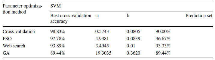 表2示出了四種不同方法尋找SVM的最佳參數(shù)的結(jié)果。從表2可以看出,網(wǎng)絡搜索和PSO的建模結(jié)果比其他兩種方法更準確。其中,PSO的ω值大于網(wǎng)絡搜索的ω值,說明PSO的容錯率較低。另外,粒子群算法能獲得全局最優(yōu)解,參數(shù)之間相互獨立,便于并行化,執(zhí)行速度快。
