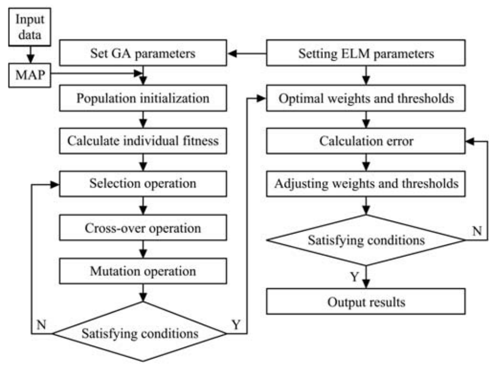 高光譜遙感系統(tǒng)獲取的全波段光譜中含有大量與水稻氮素含量無關(guān)的冗余信息,導(dǎo)致反演模型建立過程中模型誤差增大。因此,本研究利用海洋捕食者算法(MPA)提取特征波段,并將其作為遺傳算法(GA)的輸入變量,進(jìn)行變量篩選優(yōu)化后,利用的極限學(xué)習(xí)機(jī)(ELM)進(jìn)行建模以實(shí)現(xiàn)對水稻冠層氮素含量估測,具體流程如圖2所示。