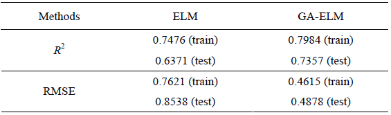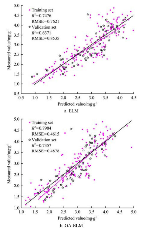 在兩種建模方法建立的水稻氮素含量反演模型中,GA-ELM模型的反演效果優(yōu)于ELM模型,訓(xùn)練集和驗(yàn)證集的R2均高于0.7357,RMSE均低于0.4878 mg/g,如圖4所示。由表1可知,采用傳統(tǒng)極限學(xué)習(xí)機(jī)算法的水稻氮素含量反演模型的模型精度弱于采用遺傳算法的水稻氮素含量反演模型。主要在于單一的ELM模型,其參數(shù)是在建模時設(shè)定的,缺乏優(yōu)化過程,即無法確定給定的參數(shù)是否是最 優(yōu)解。而通過多目標(biāo)函數(shù)優(yōu)化算法,以計算值與真實(shí)值之間的誤差大小為測量依據(jù),不斷迭代優(yōu)化ELM模型參數(shù),通過設(shè)置誤差閾值確定ELM模型參數(shù),從而提 高了水稻氮含量反演的精度。