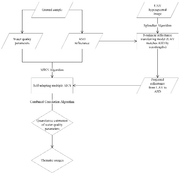 圖1顯示了用于估計(jì)水質(zhì)參數(shù)的方法。首先,地面樣本包含ASD反射率數(shù)據(jù)和水質(zhì)參數(shù)兩部分,用于建立SSNN模型。其次,利用非線性反射率傳遞模型中的UAV高光譜圖像數(shù)據(jù)作為輸入,通過將UAV的反射率傳遞到ASD來細(xì)化數(shù)據(jù)。第三,傳遞的UAV反射率數(shù)據(jù)被用于SSNN模型,從而對水質(zhì)參數(shù)進(jìn)行定量估計(jì),并利用ArcGIS軟件包生成專題圖。