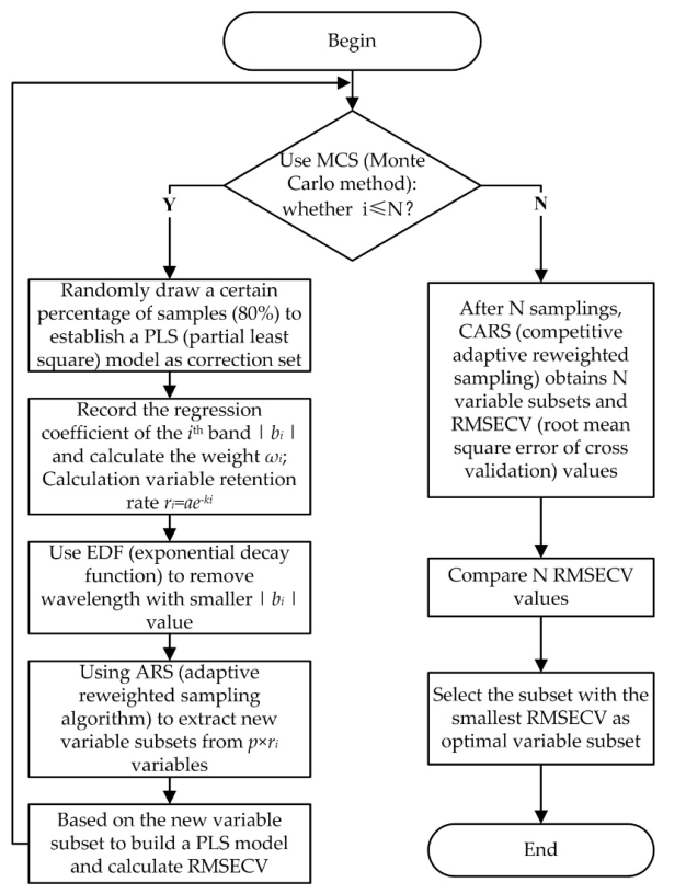 由于光照條件、空氣濕度和光譜采集儀器等干擾因素,土壤反射率光譜容易受到噪聲的影響。為了平滑波形,提高信噪比,本研究采用離散小波變換(Discrete wavelet transform, DWT)算法進(jìn)行去噪。為了選擇較少的波段作為回歸方程的自變量,本研究采用CARS-SPA算法。圖1展示了CARS算法的基本流程。