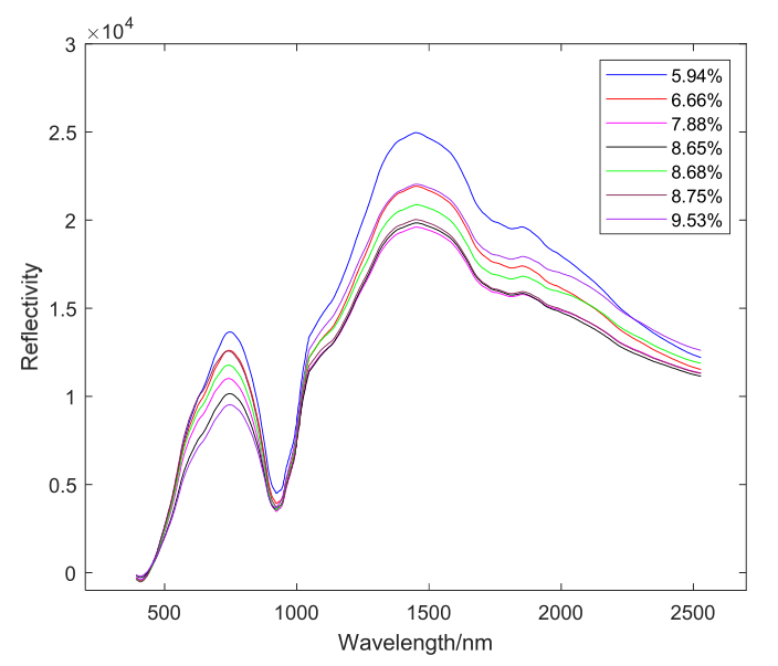 圖3展示了部分采集到的SMC及其對(duì)應(yīng)的反射率曲線(xiàn)。從圖3可以看出如下規(guī)律:(1)光譜反射率值在380 ~ 1000 nm和1000 ~ 2530 nm波段呈先升后降的趨勢(shì),即在這兩個(gè)波段處存在反射峰。此外,在近紅外波段1000 ~ 1350 nm存在一個(gè)吸收谷。(2)在380 ~ 1000 nm范圍內(nèi),光譜反射率隨SMC的增加而逐漸減小。但在1000 ~ 2530 nm范圍,這一規(guī)律不明顯。SMC差異較大的光譜曲線(xiàn)一般符合光譜隨SMC增大而減小的規(guī)律。