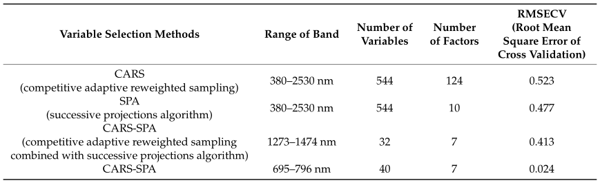 表2給出了CARS、SPA和CARS-SPA算法所選波段和RMSECV的比較。在表2中,使用CARS-SPA算法對(duì)光譜數(shù)據(jù)進(jìn)行處理時(shí),首先使用CARS對(duì)全波段進(jìn)行濾波。在獲得特征波段數(shù)據(jù)集后,利用SPA進(jìn)行更詳細(xì)的評(píng)估,最終獲得最佳波長(zhǎng)。當(dāng)CARS和SPA算法單獨(dú)處理全波段時(shí),SPA算法構(gòu)建的模型性能優(yōu)于CARS算法,而采用CARS-SPA算法的模型的性能明顯比前兩個(gè)模型更準(zhǔn)確。本研究結(jié)果表明CARS-SPA算法與CARS和SPA算法相比具有最少的特征數(shù)。因此,采用CARS-SPA算法不僅可以降低模型的復(fù)雜度,還可以提高模型的精度。