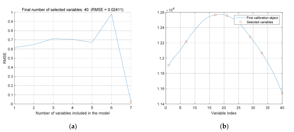 圖4 CARS-SPA算法在695 ~ 796 nm處SPA算法的波段選擇結(jié)果。模型中包含的變量數(shù)(a)以及選定變量的索引(b)。