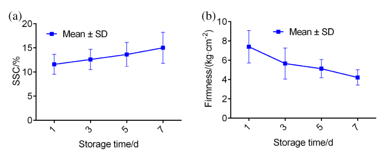 圖3 不同貯藏時(shí)間李子樣品的SSC(a)和硬度(b)