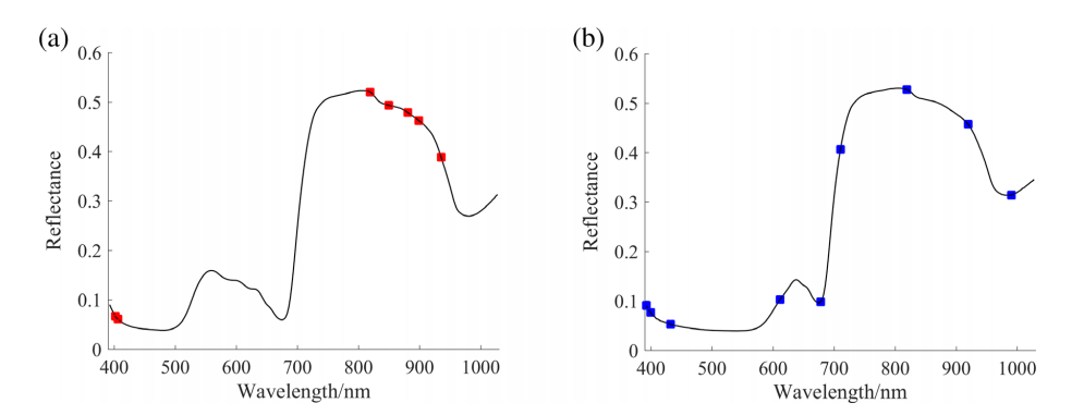 圖4 SPA選擇的用于預(yù)測(cè)SSC(a)和硬度(b)的特征波段分布