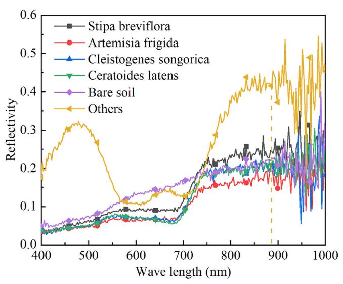 內(nèi)蒙古農(nóng)業(yè)大學(xué)杜健民教授團隊利用Gaiasky-Mini-VN高光譜相機(江蘇雙利合譜公司)獲取了研究區(qū)內(nèi)不同地物品的高光譜影像,其波段范圍為400 ~ 1000 nm,波段數(shù)為256。各類地物的光譜曲線如圖1所示。其他地物類型(墊子、小旗和垃圾)的光譜曲線與其余5種地物的光譜曲線差異最大。裸地光譜曲線在550 ~ 740 nm范圍內(nèi)呈緩慢線性增長,與4種植被的特征差異顯著。580 nm后,短花針茅的光譜曲線與其余3種植被的光譜曲線存在一定差異。閉鎖薊、冷蒿和駝絨藜的光譜曲線相似度較高。在886.6 nm之后,由于噪聲的影響,不同地物的光譜曲線都表現(xiàn)出較大的波動,最終獲得的頻帶數(shù)為205個。
