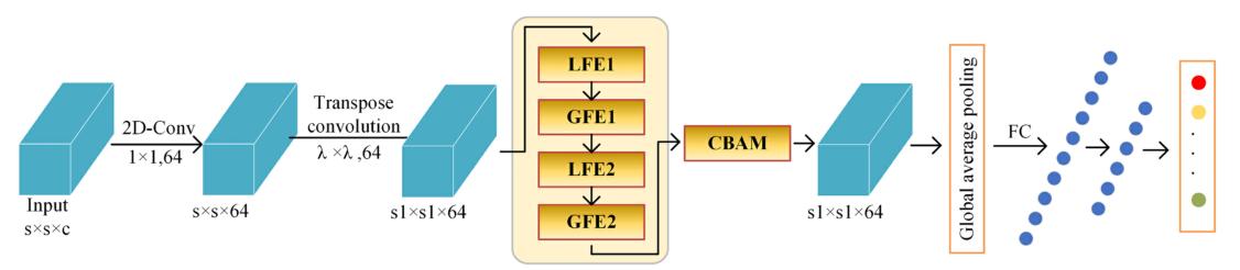 LGFEN由3個主要模塊組成:LFE模塊、GFE模塊和CBAM模塊。其結(jié)構(gòu)如圖5所示。在網(wǎng)絡(luò)中,主要采用核大小為1 × 1的二維卷積對HSI進行降維,以減少高維數(shù)據(jù)的冗余信息,經(jīng)過該卷積層后,數(shù)據(jù)的通道維數(shù)降為64。然后,通過轉(zhuǎn)置卷積對降維后的數(shù)據(jù)進行自適應(yīng)上采樣,以擬合GFE模塊中子patch的采樣過程。隨后,上采樣數(shù)據(jù)通過LFE和GFE模塊來學(xué)習(xí)HSI的局部和全局特征。最后,通過CBAM模塊對學(xué)習(xí)到的特征進行細化,增強網(wǎng)絡(luò)性能的穩(wěn)定性。所有特征學(xué)習(xí)完成后,通過全局平均池化層對空間特征進行聚合,最后通過兩個FC層進行最終分類。