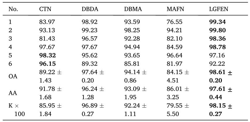 為了更好地評估本文提出的LGFEN網(wǎng)絡(luò)的有效性,我們選擇了幾種最新的HSI分類方法進行比較,包括CTN、DBDA、DBMA和MAFN。從圖6可以看出,本文提出的LGFEN方法對不同草地物種的分類效果*好,在所有方法中錯分率最低。