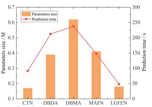 如圖8所示。從模型參數(shù)來看,LGFEN的參數(shù)數(shù)量與CTN相似;與DBDA、DBMA和MAFN相比,LGFEN的參數(shù)數(shù)量較少。從模型預(yù)測時間的角度來看,LGFEN消耗的時間成本更低,說明LGFEN在保證分類精度的同時具有更高的計算效率。