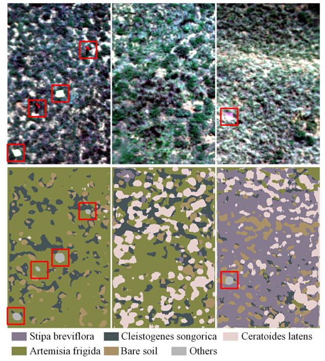 為驗證LGFEN在荒漠草原物種識別中的有效性,選取3個樣本進行可視化分析,如圖9所示。從圖中可以明顯看出,其他地面物體和裸地物體被有效識別。通過對比人工野外調(diào)查記錄和無人機航拍RGB拼接圖像,3個樣本的分類結(jié)果與實際地物的空間分布相匹配,分類性能良好。有效地區(qū)分了不同的地物,較好地保留了地物的空間特征。這表明LGFEN在荒漠草原物種的識別和分類方面具有良好的泛化能力。本研究為荒漠草原退化監(jiān)測提供了一種新的方法,可為今后的研究提供理論參考。