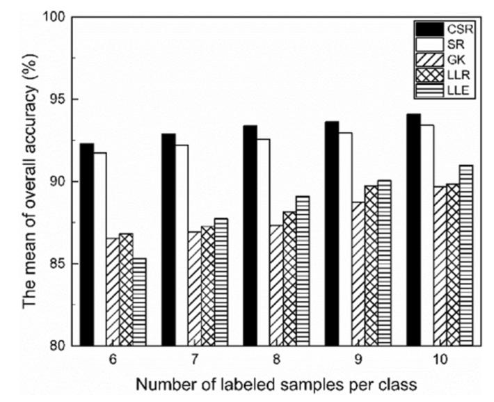 如圖3所示,與SR模型和CSR模型相比,GK、LLR和LLE三種方法的性能都相對(duì)較差。這三種方法依賴于參數(shù)K,需要手動(dòng)設(shè)置該參數(shù),這可能會(huì)受到主觀因素和高光譜數(shù)據(jù)噪聲的影響。CSR模型和SR模型都能自動(dòng)獲得鄰接關(guān)系和權(quán)重,受主觀因素影響較小。此外,在標(biāo)記樣本數(shù)量相同的情況下,CSR模型對(duì)番茄成熟度判別的整體準(zhǔn)確率高于SR模型。這表明,如果稀疏表示模型考慮了類信息,可能會(huì)有效提高學(xué)習(xí)性能。與SR模型相比,CSR模型在連接圖的構(gòu)建中利用了類概率信息。該模型輸出的完整連接圖能夠反映番茄樣本之間的真實(shí)關(guān)系。