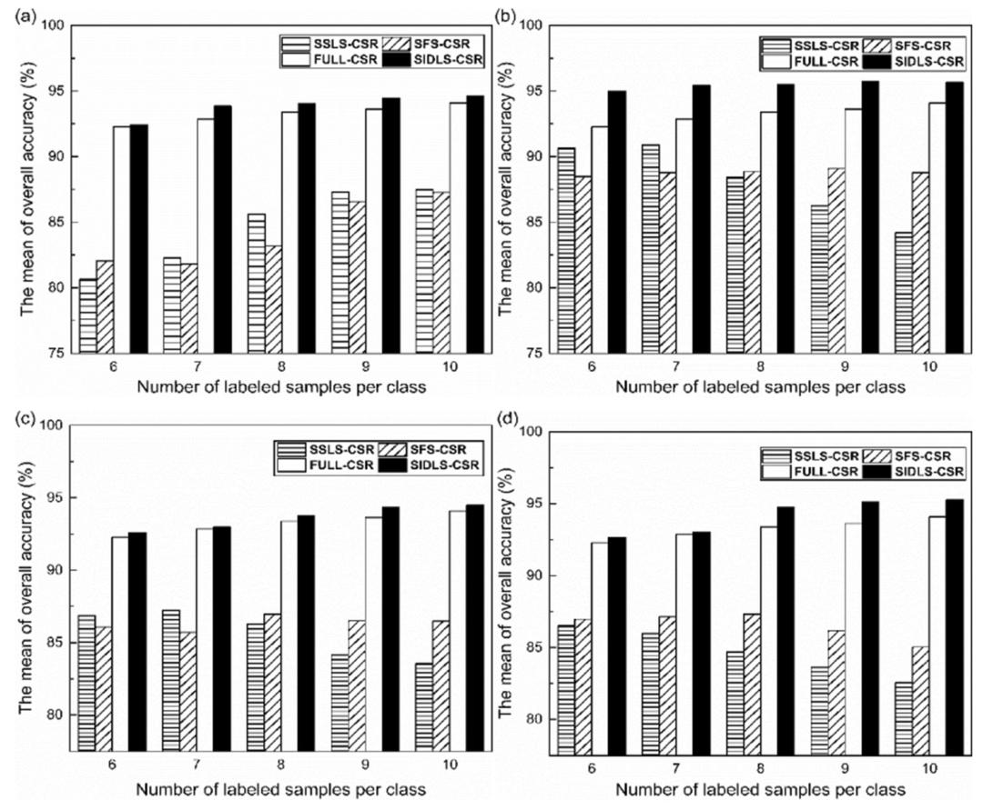 為了驗(yàn)證SIDLS算法是否能夠選擇更有效的特征子集并減少特征選擇中的信息損失,在選擇波段數(shù)量相同的情況下,將SIDLS算法與基于拉普拉斯分?jǐn)?shù)(SSLS)和半監(jiān)督fisher分?jǐn)?shù)(SFS)算法進(jìn)行了比較(圖4)。本試驗(yàn)中采用CSR模型對(duì)特征選擇后的番茄成熟度進(jìn)行判別。CSR模型有四種:全波段-CSR模型(full-CSR)、SSLS算法-CSR模型(SSLS-CSR)、SFS算法-CSR模型(SFS-CSR)和SIDLS算法-CSR模型(SIDLS-CSR)。
