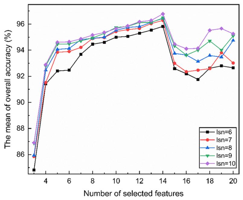 選擇特征和標(biāo)記樣本的數(shù)量會(huì)影響SIDLS算法的性能。在特征選擇后使用CSR模型進(jìn)行實(shí)驗(yàn),以測(cè)試模型性能隨所選特征數(shù)量和標(biāo)記樣本數(shù)量的變化(圖5)。當(dāng)標(biāo)記樣本數(shù)量為10時(shí),SIDLS算法的總體平均精度均有較大優(yōu)勢(shì)。當(dāng)標(biāo)記樣本數(shù)量較少時(shí),有用的先驗(yàn)信息會(huì)隨著標(biāo)記樣本數(shù)量的增加而增加。當(dāng)所選特征數(shù)為14個(gè)時(shí),SIDLS算法在番茄成熟度判別上具有較大優(yōu)勢(shì),總體準(zhǔn)確率平均為96.78%。所選特征數(shù)較少時(shí)會(huì)導(dǎo)致重要信息的丟失,較多時(shí)則會(huì)包含冗余信息和噪聲。