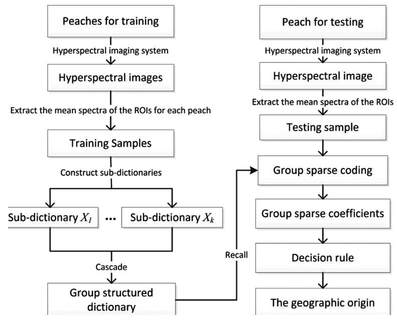 組稀疏表示(Group sparse representation, GSR)已證明具有較為出色的模式識(shí)別能力,研究中使用GSR分類器對(duì)桃子的地理來(lái)源進(jìn)行分類。將計(jì)算得到的ROI均值光譜作為樣本。對(duì)于GSR分類器來(lái)說(shuō),一個(gè)判別性的組結(jié)構(gòu)字典是必不可少的,通過(guò)如下步驟構(gòu)建:對(duì)于每個(gè)類,隨機(jī)選擇一定的樣本進(jìn)行訓(xùn)練,并逐列排列形成子字典。其次,將不同產(chǎn)區(qū)同一品種對(duì)應(yīng)的子詞典級(jí)聯(lián),構(gòu)建具有鑒別性的組結(jié)構(gòu)字典。當(dāng)給定未知來(lái)源的測(cè)試樣本時(shí),我們將其分解為鑒別組結(jié)構(gòu)字典與繼承字典可鑒別性的GSR系數(shù)向量的乘積。系數(shù)由幾個(gè)相鄰的子集組成,每個(gè)子集中的系數(shù)都為零或非零。最后,通過(guò)評(píng)估哪一類重構(gòu)誤差*小來(lái)實(shí)現(xiàn)地理來(lái)源認(rèn)證。具體流程圖如圖2所示。