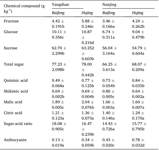 從表1可以看出,來(lái)自陽(yáng)山區(qū)域的桃總糖含量*高,來(lái)自南京地區(qū)的“白鳳”桃的總糖含量*低。不同產(chǎn)區(qū)同一品種桃的果糖、葡萄糖、蔗糖和總糖含量存在差異。同一產(chǎn)地不同品種桃的蔗糖和總糖含量相近。較高的晝夜溫差有利于糖的積累,3 - 6月桃子生長(zhǎng)期間,陽(yáng)山區(qū)的晝夜溫差高于南京。蘋果酸、莽草酸和奎寧酸的含量在不同產(chǎn)地間存在差異,而檸檬酸的含量在不同產(chǎn)地間無(wú)顯著差異。糖酸比是指水果樣品中總糖與總有機(jī)酸含量的比值,它在很大程度上決定了水果的口感和風(fēng)味,糖酸比高的桃子比糖酸比低的桃子更甜。顯然,陽(yáng)山地區(qū)桃子的糖酸比要高于南京地區(qū)?;ㄇ嗨嘏c果肉顏色有關(guān)。陽(yáng)山地區(qū)桃的花青素含量低于南京樹(shù),這也解釋了為什么“白鳳”的果肉比“湖景”的果肉更白。