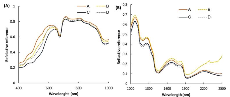 圖3 四個(gè)類別桃子的平均光譜。(A:“白鳳”來(lái)自陽(yáng)山,B:“湖景”來(lái)自陽(yáng)山,C:“白鳳”來(lái)自南京,D:“湖景”來(lái)自南京)。