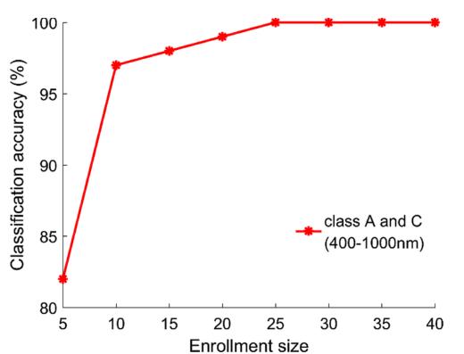 GSR分類器的成功依賴于每個(gè)類有足夠的訓(xùn)練樣本,這些樣本跨越了一個(gè)子空間,使得這個(gè)類的任何樣本都位于這個(gè)子空間上。如果假設(shè)不成立,GSR分類器很可能會(huì)失敗。因此,有必要評(píng)估訓(xùn)練樣本數(shù)量對(duì)分類結(jié)果的影響。如圖5所示,更大的注冊(cè)規(guī)模導(dǎo)致更高的分類精度;注冊(cè)規(guī)模大于或等于10足以確保GSR分類器達(dá)到95%以上的準(zhǔn)確率。當(dāng)注冊(cè)規(guī)模為5時(shí),分類準(zhǔn)確率僅為82%,這意味著假設(shè)不成立。
