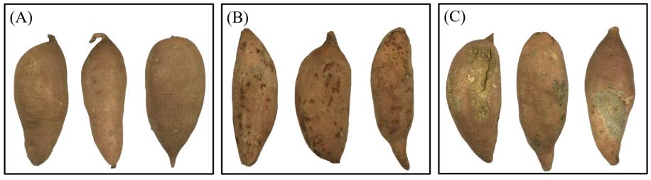 圖1 三種類型的紅薯樣本:(A)健康紅薯,(B)凍傷紅薯,(C)患病紅薯