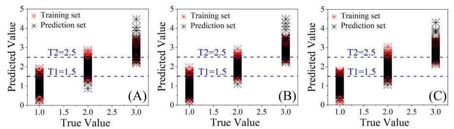 圖3 PLS-DA模型的訓(xùn)練和預(yù)測(cè)結(jié)果:(A)MCUVE-PLS-DA模型,(B)RF-PLS-DA模型,(C)SPA-PLS-DA模型