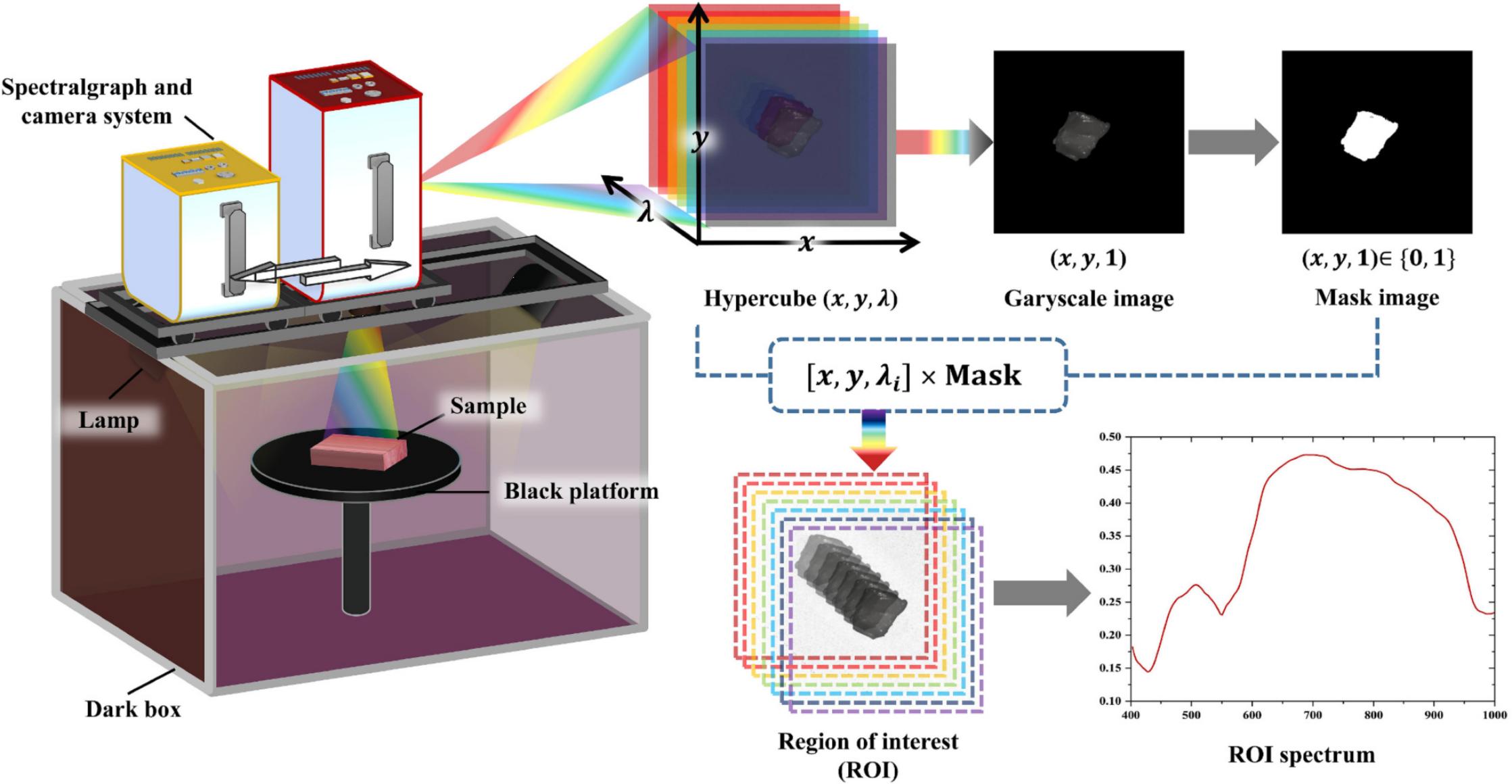 該研究從廣州當(dāng)?shù)厥袌?chǎng)隨機(jī)購(gòu)買了100只新鮮的雞胸脯肉,用無(wú)菌刀具從雞胸脯肉中心切下約30mm×30mm×20mm的立方體,共得到240個(gè)新鮮雞肉樣品。然后,將所有樣品均單獨(dú)放置在無(wú)菌一次性塑料盒中并貼上標(biāo)簽。最后,將樣品儲(chǔ)藏在4℃的環(huán)境下,在儲(chǔ)藏的第0、2、4、6、8、10、12和14天隨機(jī)抽取了30個(gè)樣品用于高光譜圖像采集和其對(duì)應(yīng)的理化值(TVB和TVC)測(cè)定。其中,利用了GaiaField-Pro-V10E型和GaiaField-Pro-N17E型高光譜相機(jī)采集了不同儲(chǔ)藏期雞肉樣品的高光譜圖像,使用圖像處理技術(shù)提取了雞肉樣品區(qū)域的平均光譜數(shù)據(jù),光譜數(shù)據(jù)提取流程如圖1所示。