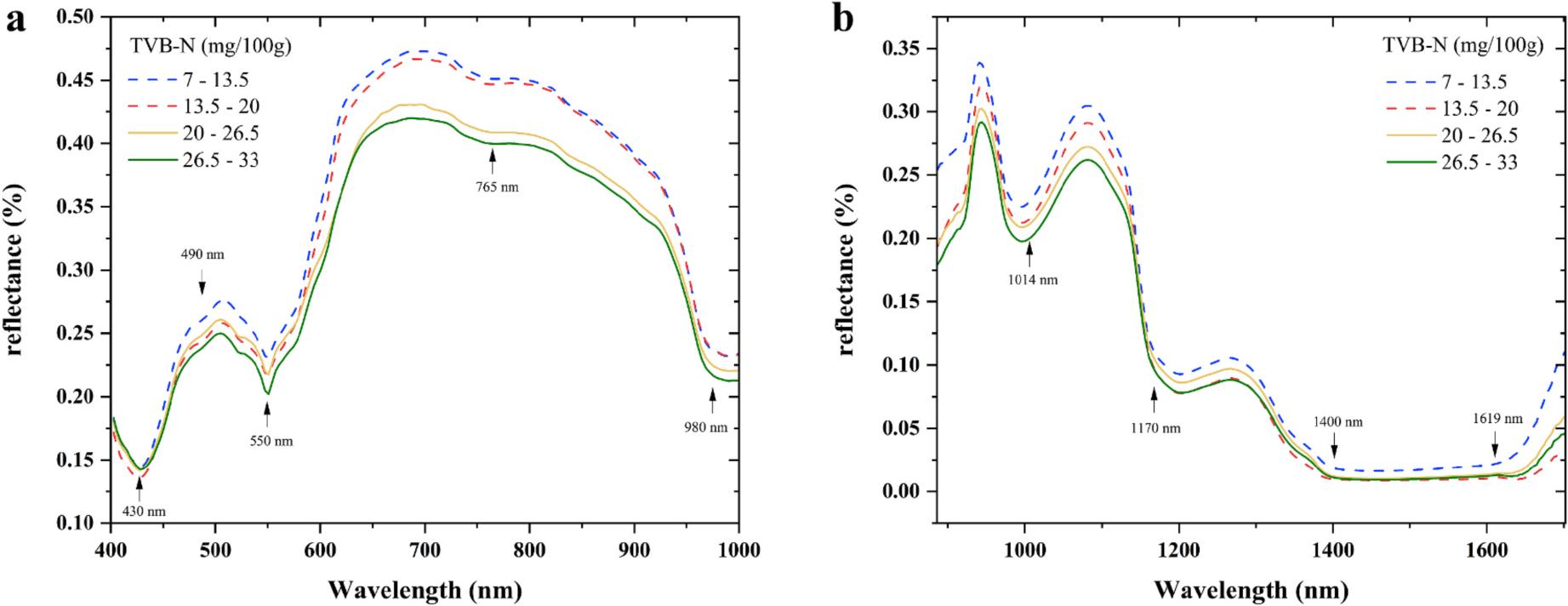 圖3 TVB-N含量不同范圍的平均光譜曲線(a:Vis-NIR,b:NIR)