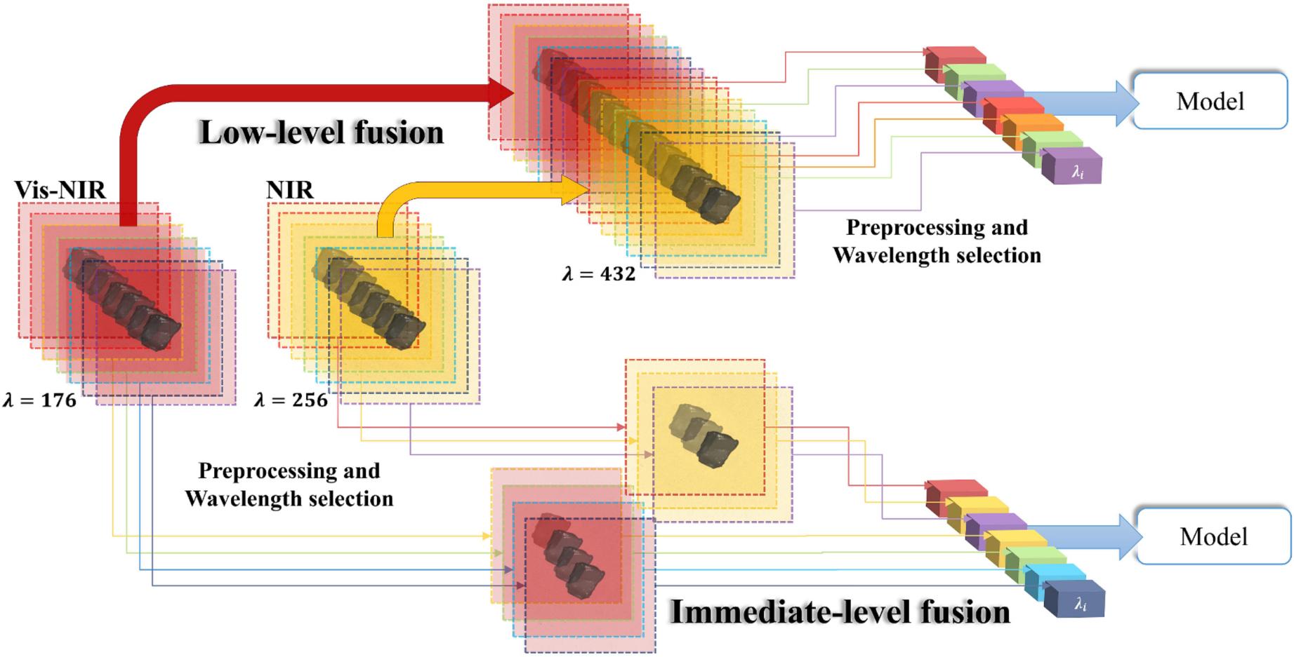 2)數(shù)據(jù)融合策略。該研究采用了低級(jí)融合方法(LLF)和中級(jí)融合方法(ILF)分別對(duì)雞肉的Vis-NIR和NIR光譜范圍的數(shù)據(jù)進(jìn)行了融合,數(shù)據(jù)融合過(guò)程如圖4所示。其中,低級(jí)融合方法是指對(duì)Vis-NIR和NIR范圍的光譜數(shù)據(jù)進(jìn)行串行拼接;中級(jí)融合方法是指分別提取Vis-NIR和NIR范圍的特征并進(jìn)行串行拼接。然后,將單數(shù)據(jù)(Vis-NIR、NIR)、LLF融合數(shù)據(jù)和ILF數(shù)據(jù)融合分別用于建立雞肉的TVB-N含量和TVC含量預(yù)測(cè)模型。