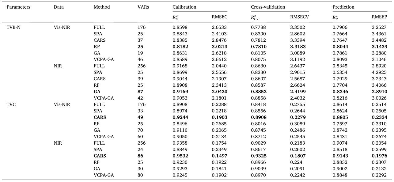 4)單數(shù)塊(Vis-NIR、NIR)建立的PLSR模型分析。該研究使用了連續(xù)投影算法(SPA)、競(jìng)爭(zhēng)性自適應(yīng)加權(quán)算法(CARS)、隨機(jī)森林(RF)、遺傳算法(GA)和變量組合集群分析法聯(lián)合遺傳算法(VCPA-GA)五種特征提取方法分別提取了Vis-NIR、NIR光譜范圍的特征波長(zhǎng),并建立PLSR模型預(yù)測(cè)雞肉的TVB-N含量和TVC含量,建模結(jié)果如表1所示。對(duì)于雞肉的TVB-N含量預(yù)測(cè)而言,使用GA方法提取NIR光譜范圍內(nèi)的87個(gè)特征波長(zhǎng)建立的模型預(yù)測(cè)TVB-N含量精度*高,其RP2和RMESP分別為0.8346,2.8910,這與全光譜建模的結(jié)果相似,而與256個(gè)全光譜波長(zhǎng)相比,波長(zhǎng)數(shù)量減少了近66.02%。對(duì)于雞肉的TVC含量預(yù)測(cè)而言,使用CARS方法提取NIR光譜范圍內(nèi)的86個(gè)特征波長(zhǎng)建立的模型預(yù)測(cè)TVB-N含量精度*高,其RP2和RMESP分別為0.9143,0.1976,這與全光譜建模的結(jié)果相似,而與256個(gè)全光譜波長(zhǎng)相比,波長(zhǎng)數(shù)量減少了近66.40%??偟膩?lái)說(shuō),盡管特征波長(zhǎng)提取方法沒(méi)有顯著改善模型的預(yù)測(cè)性能,但它顯著減少了波長(zhǎng)的數(shù)量,這是非常有意義的。