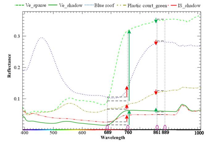 從760 nm處的綠色箭頭可以看出(圖1),760 nm和689 nm兩個波段的植被光譜值變化明顯。相比之下,非植被地物的光譜值變化較小。植被在陰影下的光譜值在889 - 861 nm波段呈上升趨勢(861 nm處綠色箭頭)。然而,非植被地物有相反的趨勢。因此,通過四波段組合構(gòu)建EVI來增強陰影下的植被信息。由于861 nm和889 nm兩個波段的差值太小,我們設(shè)置增強系數(shù)α。公式如下所示。