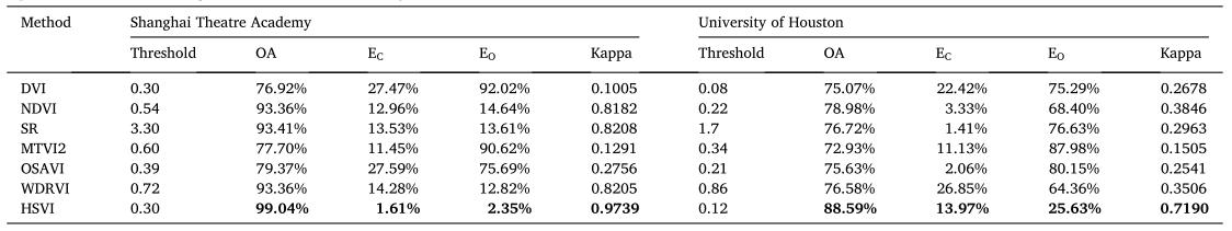 對于表1中的上海戲劇學(xué)院數(shù)據(jù)集,DVI、MTVI2和OSAVI的OA和Kappa最低。它們的EO值非常高,說明遺漏了一些植被。NDVI、SR和WDRVI精度*高。他們的EC和EO更高。這表明他們將非植被表面錯誤地標(biāo)記為植被。相比之下,HSVI的植被提取精度最高。HSVI具有最低的EC和EO,顯示了其在減少陰影和新材料對分類結(jié)果干擾方面的優(yōu)勢。對于休斯頓大學(xué)數(shù)據(jù)集,只有HSVI獲得了*好的植被提取精度。相反,其余6種VIs獲得了較高的EO值,表明它們在陰影條件下的性能較差。因此,我們可以得出結(jié)論,HSVI改善了復(fù)雜條件下的植被提取。