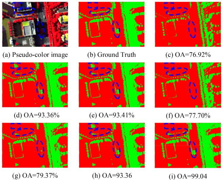 圖5 休斯頓大學(xué)的植被提取結(jié)果:(a)RGB圖像,(b)真實值,(c)DVI,(d)NDVI,(e)SR,(f)MTVI2,(g)OSAVI,(h)WDRVI,(i)HSVI