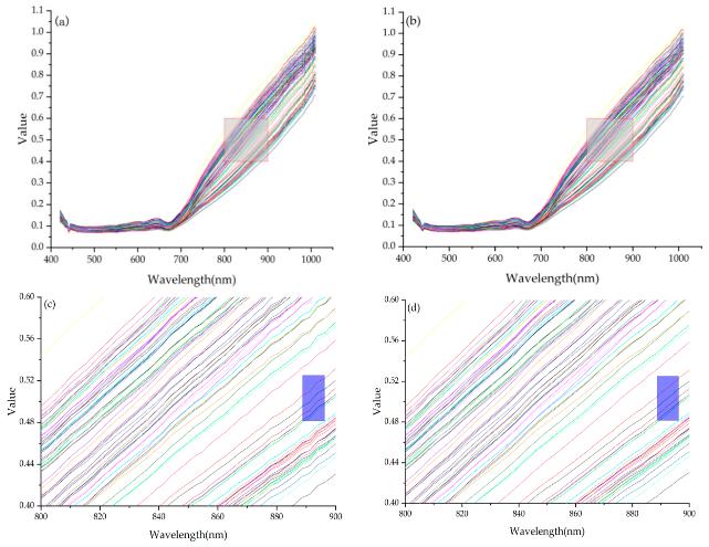 圖3 藏茶光譜曲線。原始數(shù)據(jù)(a);通過(guò)SG算法預(yù)處理的數(shù)據(jù)(b);(c)圖為(a)中紅框的放大視圖;(d)圖為(b)中紅框的放大視圖。
