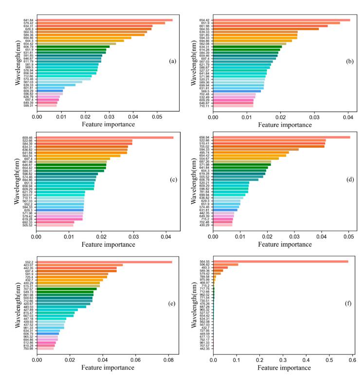 圖4 由不同算法選擇的特征波段。GB(a);AdaBoost(b);RF(c);CatBoost(d);LightGBM(e)和XGBoost(f)。