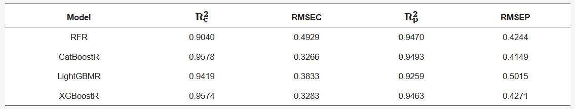 表2展示了不同模型的全波段預(yù)測(cè)結(jié)果。CatBoostR模型具有最高的準(zhǔn)確度,在校準(zhǔn)和測(cè)試集上的R2分別為0.9578和0.9493。RFR模型預(yù)測(cè)效果較差,校準(zhǔn)R2僅為0.9040。