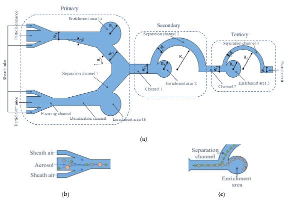 江蘇大學(xué)毛罕平教授團隊設(shè)計了如圖1a所示的微流控芯片。該芯片可分為三種結(jié)構(gòu),每種結(jié)構(gòu)都有相應(yīng)的分離通道和富集區(qū)。一級結(jié)構(gòu)設(shè)計為雙入口對稱預(yù)處理通道,其中空氣中的孢子首先通過入口進入一級結(jié)構(gòu),然后通過鞘狀流道。鞘狀流道的主要功能是將含有孢子的氣流擠壓到微通道中,保證進入芯片的孢子在微通道中心形成單一的孢子流陣列。在鞘狀流道之后增加一個減速通道,以減少附加慣性力對孢子運動的影響。通道中的孢子在隨氣流移動時也受到慣性的影響。質(zhì)量和尺寸較小的孢子會隨著氣流移動,進入分離通道,到達結(jié)構(gòu)的下一層進行分離;而質(zhì)量和大小較大的孢子由于慣性會繼續(xù)向原來的方向移動,最終會沖進富集區(qū)。鞘流和分離通道的工作原理分別如圖1b、c所示。