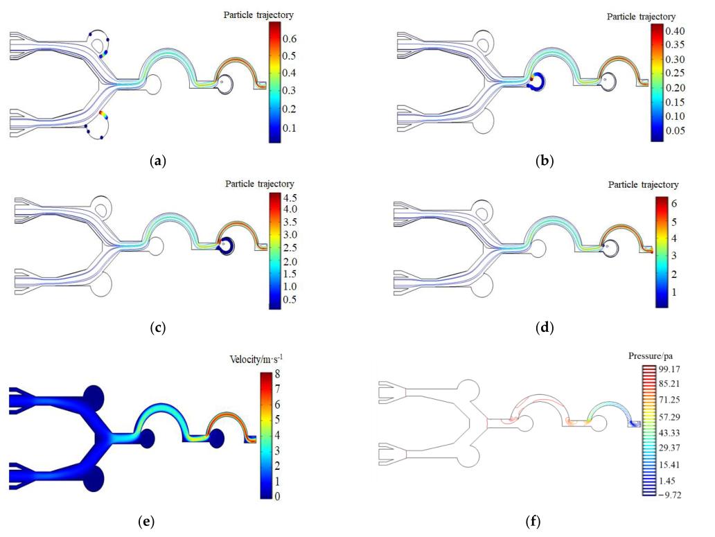 圖2a-d為本研究設(shè)計的微流控芯片對不同粒徑顆粒富集效果的模擬。粒徑大于或等于18 µm的顆粒由于慣性作用會沖進富集區(qū)1a和1b,粒徑小于18 µm的顆粒會隨著氣流進入二級結(jié)構(gòu),粒徑在8 µm ~ 17 µm的顆粒會沖進富集區(qū)2。第三階段的分離和富集結(jié)構(gòu)與第二階段相似,粒徑在4 μm ~ 7 μm之間的顆粒進入富集區(qū)3,粒徑小于4 μm的顆粒直接從出口排出。微流控芯片通道的速度分布圖如圖5e所示,微流控芯片通道的壓力分布強度圖如圖5f所示。