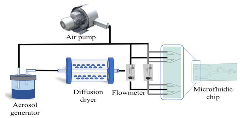 圖3為孢子富集實驗平臺。將制備好的孢子懸浮液放置在氣溶膠發(fā)生器中,空氣經(jīng)氣泵壓縮后送入氣溶膠發(fā)生器,產(chǎn)生生物氣溶膠流。氣溶膠流進入擴散干燥器以除去水分。烘干機后連接流量計,將流速設(shè)置為12.5 mL/min,與芯片模擬中的數(shù)值相同。同時,每個鞘流口分別連接另一個微流量計,并設(shè)定鞘流口流量為2.5 mL/min。最后的氣溶膠流進入微流控芯片的通道以分離和富集孢子。打開氣泵2 min后,孢子富集實驗完成。富集完成后,用鑷子夾住PDMS膜,緩慢取出。去除PDMS層的微流控芯片放置在顯微鏡下進行直接觀察。